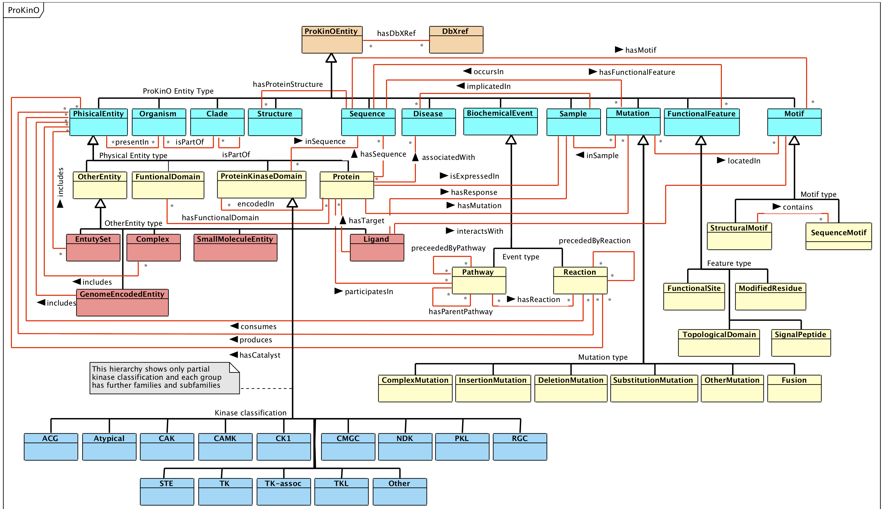 | The picture below is an outline of the ProKinO schema as a UML class diagram. It shows major ProKinO classes and object properties (relationships connecting ProKinO classes). It is available in PDF, as well |